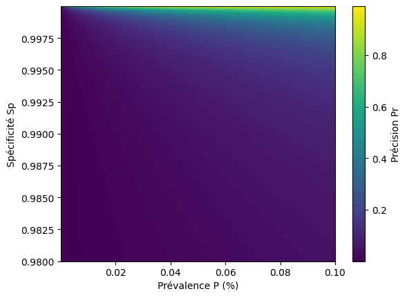 Sur ce graphe, la zone en vert-jaune correspond aux couples (P, Sp) pour lesquels la précision devient acceptable. On observe que cette zone n’apparaît que pour des valeurs de spécificité extrêmement élevées. Si élevées en fait, qu’elles sont complètement irréalistes dans la vraie vie.