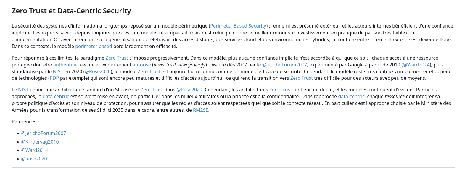 Les liens Obsidian et les liens Markdown utilisés par Gitea n’utilisent pas le même format. Dans Obsidian, un lien comme [[PDP] ou [[Measham2001|Policy Decision Point]] ne pointe pas vers un chemin de fichier explicite, mais vers une note identifiée uniquement par son nom. C’est Obsidian qui se charge de résoudre le lien, et de retrouver le bon fichier, quel que soit son emplacement réel dans l’arborescence. À l’inverse, Gitea ne comprend que des liens Markdown classiques, avec des chemins relatifs explicites vers des fichiers existants, par exemple : [@Measham2001](../../../Reading%20notes/@Measham2001.md).