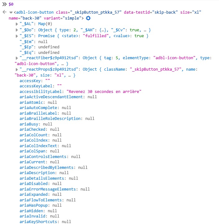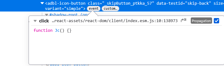 On retrouve bien notre bouton “skip-back”, qui est associé à un event listener en Javascript. On peut cliquer sur le petit bouton “event” pour obtenir le détail de ce listener.