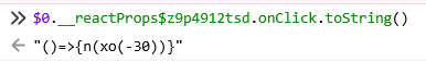 On déplie maintenant la propriété reactProps de notre bouton. On y retrouve effectivement une fonction h(). On peut afficher son contenu avec : $0.__reactProps$z9p4912tsd.onClick.toString().