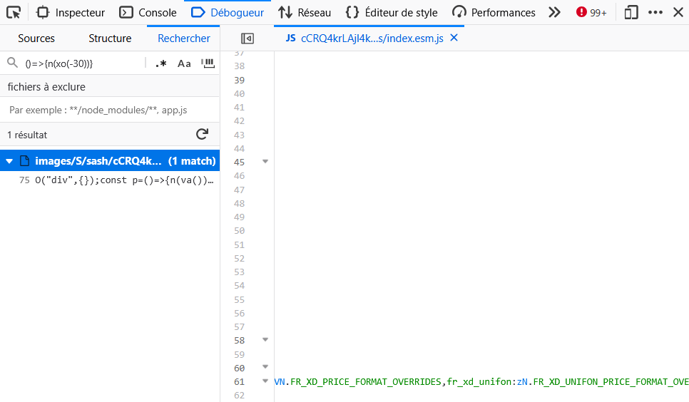 On va dans l’onglet “Débogueur”, puis dans “Rechercher” à gauche, et on entre le code suivant : ()=>{n(xo(-30))}.