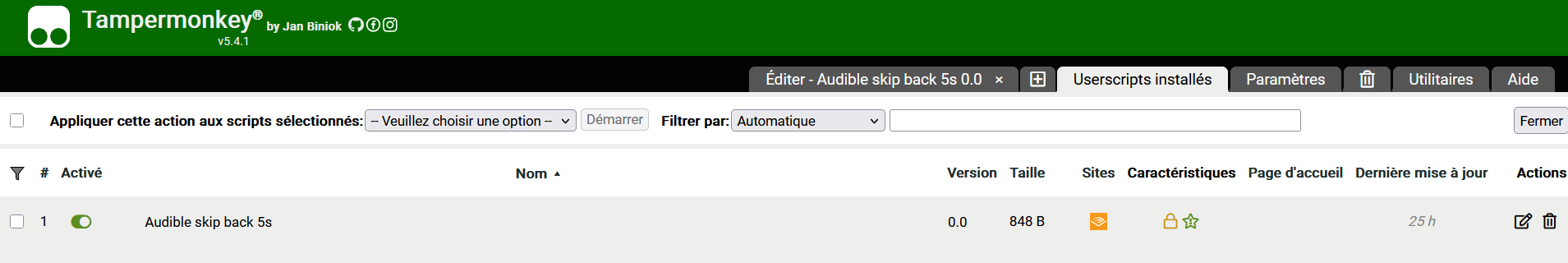 Cependant, en passant par la console, cette modification ne dure que jusqu’au rechargement de la page. Il faut donc maintenant automatiser l’injection du script à chaque ouverture du lecteur Audible. Pour ça, l’outil le plus populaire est Tampermonkey.